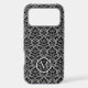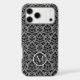 Vintage influenced leafy baroque style damask surface pattern design in black detail on a gray background, with encircled initial/letter in light gray on a transparent black circle background, which can be altered and personalized.