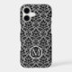 Vintage influenced leafy baroque style damask surface pattern design in black detail on a gray background, with encircled initial/letter in light gray on a transparent black circle background, which can be altered and personalized.