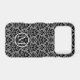 Vintage influenced leafy baroque style damask surface pattern design in black detail on a gray background, with encircled initial/letter in light gray on a transparent black circle background, which can be altered and personalized.