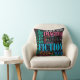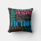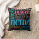 The front of this throw pillow features fiction writing vocabulary that is arranged into word art. Multiple colours and fonts are set against a black background. The back of the pillow is a solid turquoise colour. Available in the lumbar style.