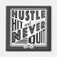 Text reads: Hustle, Hit And Never Quit, with a crossed field hockey sticks icon.