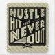 Text reads: Hustle, Hit And Never Quit, with a crossed field hockey sticks icon.