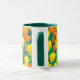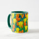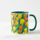 Mug in a pattern of orange and yellow tulips and green leaves in a field