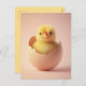 A fluffy yellow chick with an adorably fierce expression peeks out from a cracked eggshell against a soft pastel background. Perfect for Easter themes, baby products, or playful branding.