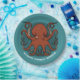 Paper plates with a nautical theme, featuring a cartoon of a rust red octopus with a mean frown, curling tentacles spread in all directions and fleshy coloured suckers exposed. A shoal of fish stream past in the background. For fans of octopuses and cephalopods with attitude. Personalise with a simple change to the editable text which curves around the image. Customise it to change the ocean green background colour which surrounds and shows through the semi-transparent background shape.