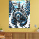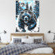 This captivating illustration captures a powerful bear mid-roar charging through a snowy forest with towering pines and distant peaks under a cloudy sky, rendered in bold blue and black tones for a dramatic wildlife scene, great for adding untamed energy to custom apparel, mugs, or outdoor gear.