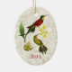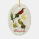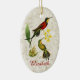 Two red, yellow and green hummingbirds rest on a bright yellow orchid, with a light gold marble texture background. Personalisation options on front and back, or remove text for an elegant nature-inspired addition to any Christmas tree. Perfect all occasion gift for hummingbird lovers.