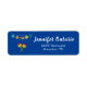 This colourful birthday party return address label features a string of colourful decorative cut paper with a pretty piñata hanging from the centre and a pair of maracas. This address label features bright colours with a dark blue background.