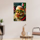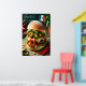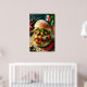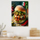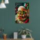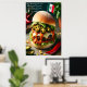 Ignite your taste buds with this fiery Fiesta Firecracker Burger. A spiced beef patty, grilled to perfection, is topped with melted Oaxaca cheese, roasted jalapeños, a generous smear of chipotle mayo, and fresh avocado slices. All nestled inside a corn-dusted bun. A small Mexican flag adds a festive touch, while a blurred backdrop of chilli peppers and fresh cilantro completes this Mexican culinary celebration.