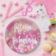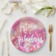 NewParkLane - Paper Plates, with fun quote 'Fifteen & Fabulous' in a trendy script typography, against a glamourous sparkling pink background.