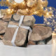 This gift wrap is perfect for a 5th Wedding Anniversary. It features a stack of logs as a background, keeping in with the wood theme.