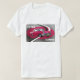 Fifties classic chevrolet red and white car shown on a circular red background. In addition, a forward looking black and white swoop design running through the design. License plate shows a 1957 classic chevy.