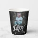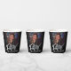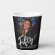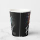 Fifty silver coloured style effect script text on black paper cups. Personalise these cups with two photos of your birthday girl turning 50, one on each side (for past and present plus add your own name or message. Ideal for a 50th birthday party or surprise half century event. Other years and matching items are available. © Original design by Sarah Trett for www.mylittleeden.com on Zazzle.
