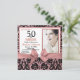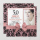 Rose gold glitter black damask | 50th Birthday Invitations. Fifty and Fabulous! A beautiful modern elegant pink rose gold glitter floral damask 50th Birthday Party Invitations you can personalise and send out your fiftieth birthday party celebration. At the centre pretty pink bow. Replace the sample photo with your own. The words "50 and Fabulous" are set using popular typhography. You can personalise script fonts and font colours in the design. Great for all occasion just change age. Birthday party invites template you can customise with your own details and age. Pretty feminime Template for 15th, Sweet 16, Quinceanera, 18th, 20th, 21st, 30th, 40th, 50th, 60th, 70th, 80th, 90th, 100th, Fabulous girls and womens.