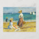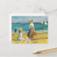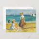 Figures on the Beach is an artwork by French Impressionist artist Pierre-Auguste Renoir (1841-1919). The fine art painting depicts two female figures at the beach. The seated figure is shown in profile, her right hand holding a parasol on the sand. She exchanges a look with the standing figure to her right who holds a basket at her side. The women are joined by a small white dog, and before the water stands a young boy dressed in blue, seemingly throwing an object into the ocean. The standing figure serves as a vertical force which connects the horizontally banded foreground, water, and sky.