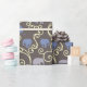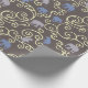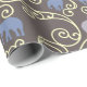 Grey and blue elephants amongst yellow filigree flourishes against a coffee brown background.