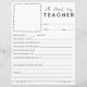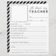 A fun teacher appreciation gift at the end of the school year to give a teacher thanks. This an all about my teacher fill in the blank letter with space for your child to write by hand and a blank arrow box to write or draw something in. The back of this teacher letter gift is a striped white and black. This would make a cute teacher keepsake. Please take a look at my teacher gift collection for more ideas.