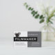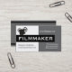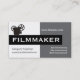 Filmmaker grey, white, black eye-catching business card featuring a vitage 35 mm movie style camera in black on white, grey background and a black band with the text "FILMMAKER". A great professional business card template for the film maker, director, movie maker, film producer, cinematographer, videographer, video producer, camera operator or cameraman.