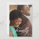 An elegant save the date announcement card, that features your favourite engagement photo overlaid with "Finally" in elegant white script font and your wedding date. The reverse is in solid black with your wedding details in black.