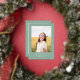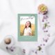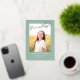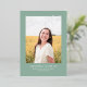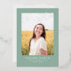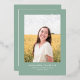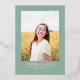 This stylish graduation announcement and invitation features a single photo with the word finally in silver foil above it on a sage green background. The back of the card can be used for an invitation or a personal message.