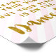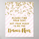 Please find your seat but your place is on the dance floor wedding sign poster in light pastel blush pink and white stripes pattern with gold confetti and handwritten style lettering.