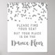 Please find your seat but your place is on the dance floor wedding sign poster in white and silver confetti pattern with handwritten style lettering.