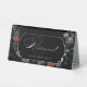 This chic tent sign features an 18th century Dutch floral still life, including white, red and gold tulips and wildflowers on a black background with custom centre label, complementary floral graphics and elegant flowing custom calligraphy.