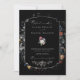 This chic wedding invitation design features an 18th century Dutch floral still life, including white, red and gold tulips and wildflowers, on a black background with custom centre label, complementary floral graphics and elegant flowing custom calligraphy. The back features an optional floral wreath with monogram template.