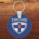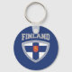 The national flag of Finland is infused into a shield shape which has blue and white outlines in the colours of the flag. The country name is added above the image.