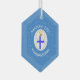 Angel dressed in the blue and white flag of Finland, celebrates Hanukkah for families of multiple religions. The Hanukkah Finnish angel is found on a hexagon shaped glass ornament,, flying in the center of of a circle of white squiggly squares. It is surrounded by blue squiggly squares. Personalize with a name and customize with the year. Or, add your own text.