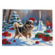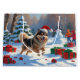A fluffy Finnish Lapphund runs joyfully through the snowy winter scene, wearing a festive red Christmas hat. This charming design showcases the breed’s thick coat, playful personality, and affectionate nature while capturing the warmth and magic of the holiday season. A delightful winter moment full of festive cheer.