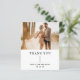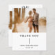 Contemporary and modern style budget wedding thank you card featuring a simple and minimal design with "Thank You" along with your names and wedding date in bold typography below your favourite photo. The back has a second picture, your three initial monogram and your personalised message. This minimalist black and white typographic wedding thank you card can be customised to any colour you choose in the design editing tool.