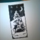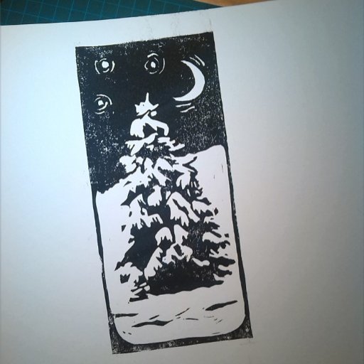 Black and white lino print of a peaceful winter scene: a lonely fir tree standing in a snowy landscape at nighttime, with a starry sky above. "Merry Christmas" written on the back.
