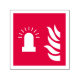 Fire alarm flashing light and flame icon on red background.