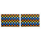 A vibrant chequerboard pattern featuring alternating rows of orange, yellow, light blue, and blue squares against a black background. The design is bold and energetic.