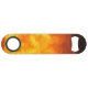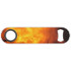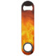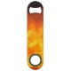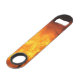 A bottle opener featuring a photo of flames.