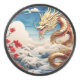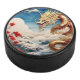 Fire breathing dragon red blue and gold scales hockey puck