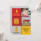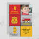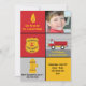 This firefighter birthday party invitation features a fire hydrant, a fire engine, a volunteer fire department badge, a place for your child's photo and customisable text fields for your party information.