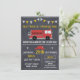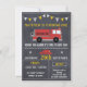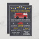 This boy's chalkboard birthday party invitation features a cute fire engine and fireman's cap on a scanned chalkboard background. The design also includes a white and yellow bunting flag and a few decorative elements such as stars, banner and dividers. The design is influenced by chalkboard art and also stencil art. This chalkboard invitation can be used for various ages and is particularly suitable for a fire engine theme birthday party. It's ready for you to personalise.