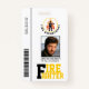 Fire fighter/fireman department photo id template Badge. It features a fire fighter with his axe in flames which can be changed with your department logo, photo, the words "Fire fighter" in bold typography in black and yellow and barcode.