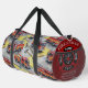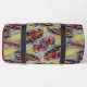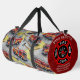A grey duffle bag is covered in a vibrant pattern of red fire trucks, complete with ladders and fire axes, set against a light-coloured ground with yellow splashes. A prominent side pocket, adorned with a red fire department emblem, proudly displays "FIRE RESCUE," "JENNY SAMSMITH," "FIRE DEPARTMENT," and "Vancouver B.C.," creating a personalised and functional item for a firefighter. Personalise with your name and department home town and more. monogram