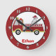 This super cute clock features a red border with numbers, a fire truck and a cute dalmatian dog. You can customise the word "Ethan" with your own name.