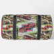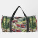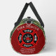 This duffle bag features a captivating pattern of red fire trucks navigating a winding road through a lush green forest. The vibrant scenery with tall pine trees and a subtle mountain backdrop creates an adventurous feel. A prominent side pocket with a fire department emblem is personalised with "FIRE RESCUE," "JENNY SAMSMITH," and "Vancouver B.C.," making it a unique gift for a firefighter. Personalise with your name and department home town and more. monogram