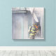 A canvas print featuring a photo of a firefighter battling a house fire.