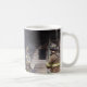 A coffee mug featuring a photo of firefighters battling a house fire.