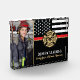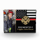 This design features a firemen's flag with black and white stripes, and a thin red line stripe as well. "Congratulations" and a fireman's badge sits above the name of the graduating firefighter.