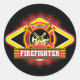 Firefighter logo with firefighter badge with raging flames, fire ladder and fire hydrant symbols! Large firefighter text! Bold firefighter tees and gifts! Perfect for firefighting fundraisers and fire departments! Blazing red and yellow colours!