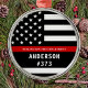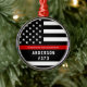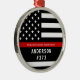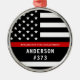Personalised Thin Red Line Ornament - American flag in Firefighter Flag colours, modern black red design . Personalise with firefighter name, or fire department. This personalised firefighter ornament is perfect for fire departments, fire service,or as a memorial keepsake and fire department Christmas gifts o\r stocking stuffers. Order these firefighter ornaments bulk wholesale for the fire academy or fire department gifts, firefighter christmas stocking stuffers. COPYRIGHT © 2020 Judy Burrows, Black Dog Art - All Rights Reserved. Firefighter Personalised Fireman Thin Red Line Metal Ornament