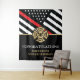 This design features a firemen's flag with black and white stripes, and a thin red line stripe as well. "Congratulations" and a fireman's badge sits above the name of the graduating firefighter. This design also works great for retiring firefighters, lieutenants, or chiefs. Celebrate in style!