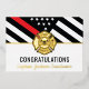 This design features a firemen's flag with black and white stripes, and a thin red line stripe as well. "Congratulations" and the fireman's badge text sits above the name of the graduating or retiring firefighter, lieutenant, or chief. Celebrate in style!